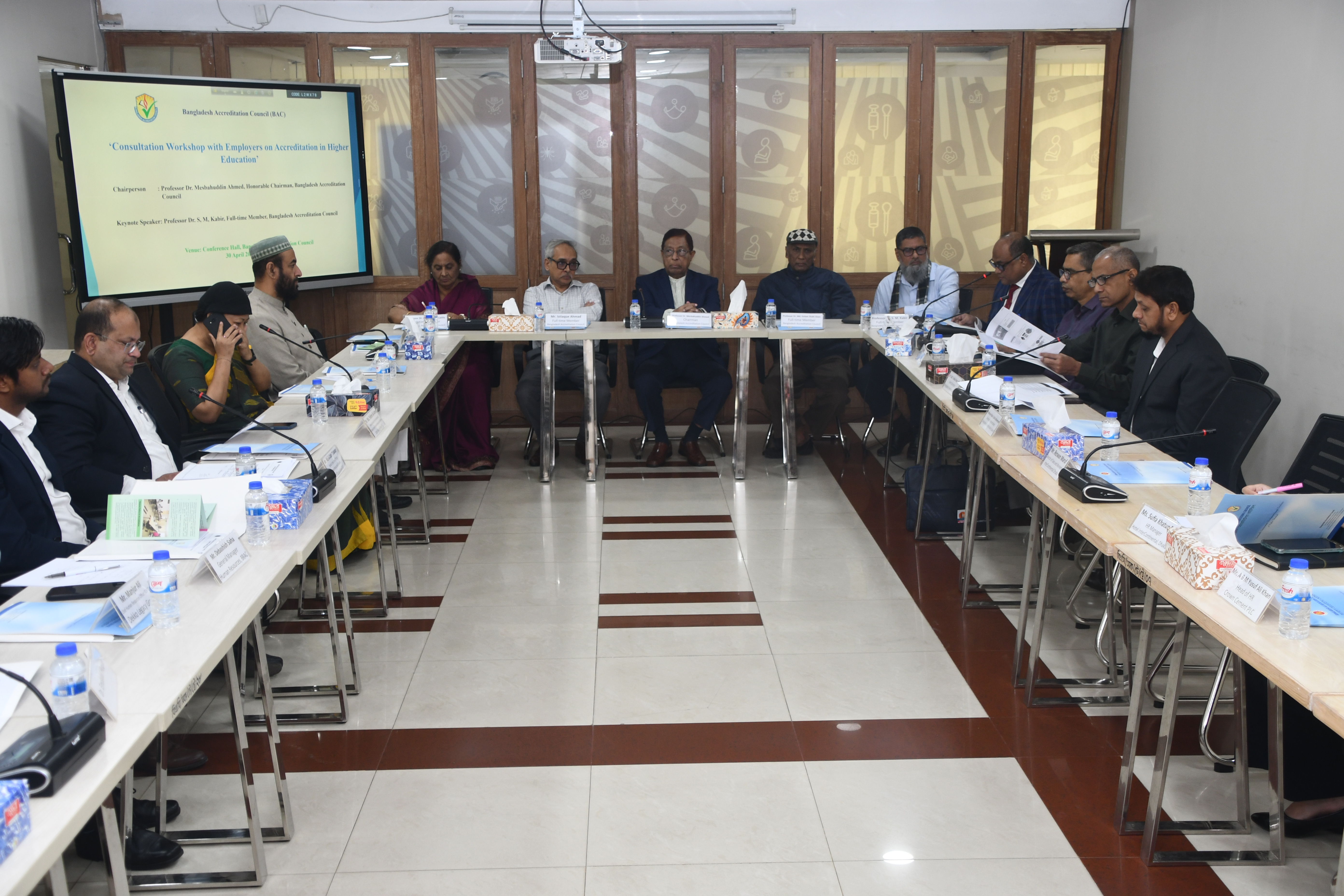 ৩০ এপ্রিল ২০২৫ খ্রিষ্টাব্দ তারিখ সকাল 10:০০ ঘটিকায় বাংলাদেশ অ্যাক্রেডিটেশন কাউন্সিলের সম্মেলন কক্ষে নিয়োগকারী কর্তৃপক্ষের সাথে অ্যাক্রেডিটেশন কার্যক্রম অবহিতকরণ বিষয়ক একটি মতবিনিময় কর্মশালা ‘Consultation Workshop on Accreditation in Higher Education’ অনুষ্ঠিত হয়। উক্ত কর্মশালায় সম্মানিত অতিথি হিসেবে উপস্থিত ছিলেন দেশের নিয়োগকারী কর্তৃপক্ষের Chairman, CEO, Director (Admin), Head of HR, General Manager, Chief Human Resources Officer, Senior Assistant Vice President & Deputy Head, Senior Executive Officer ও HR Manager. উক্ত কর্মশালায় সভাপতিত্ব করেন বাংলাদেশ অ্যাক্রেডিটেশন কাউন্সিলের মাননীয় চেয়ারম্যান প্রফেসর ড. মেসবাহউদ্দিন আহমেদ। কর্মশালায় আলোচক হিসেবে উপস্থিত ছিলেন বাংলাদেশ অ্যাক্রেডিটেশন কাউন্সিলের পূর্ণকালীন সদস্য প্রফেসর ড. মো: গোলাম শাহী আলম, পূর্ণকালীন সদস্য জনাব ইসতিয়াক আহমদ ও প্রফেসর ড. গুলশান আরা লতিফা। কর্মশালায় ‘Accreditation in Higher Education’ বিষয়ক মূল প্রবন্ধ উপস্থাপন করেন কাউন্সিলের পূর্ণকালীন সদস্য প্রফেসর ড. এস, এম, কবীর। কর্মশালায় পরিচালনা পর্ব পরিচালনা করেন কাউন্সিলের সচিব প্রফেসর এ.কে.এম. মুনিরুল ইসলাম। কর্মশালায় আরও উপস্থিত ছিলেন কাউন্সিলের সংযুক্ত কর্মকর্তা প্রফেসর পারভেজ আক্তার, কাউন্সিলের পরিচালক প্রফেসর নাসির উদ্দীন আহাম্মেদ, পরিচালক প্রফেসর গৌতম চন্দ্র রায়, পরিচালক মোহাম্মদ তাজিব উদ্দিন ও উপপরিচালক ড. রীতা পারভীন। কর্মশালায় র্যাপেটিয়ারের দায়িত্ব পালন করেন উপপরিচালক জনাব মোহাম্মদ আবদুল আলীম ও উপপরিচালক জনাব ফারজানা শারমিন। কর্মশালাটি সঞ্চালনা করেন অ্যাক্রেডিটেশন বিভাগের সহকারী পরিচালক জনাব নাছিমা আক্তার। কর্মশালাটির সার্বিক কাজে সহযোগিতা করেন সহকারী পরিচালক জনাব সাবরিনা তাজনুর। কর্মশালায় আগত অতিথিগণ বাংলাদেশ অ্যাক্রেডিটেশন কাউন্সিলের কার্যক্রম সম্পর্কে অবহিতকরণের জন্য কর্তৃপক্ষের প্রতি কৃতজ্ঞতা জ্ঞাপন করেন এবং উচ্চশিক্ষার মান উন্নয়নে আ্যাকাডেমি-ইন্ডাস্ট্রি কোলাবোরেশন সুসংহত করা প্রয়োজন মর্মে অভিমত প্রকাশ করেন।