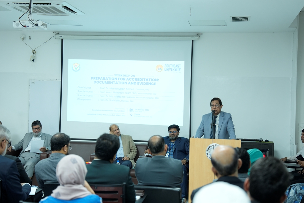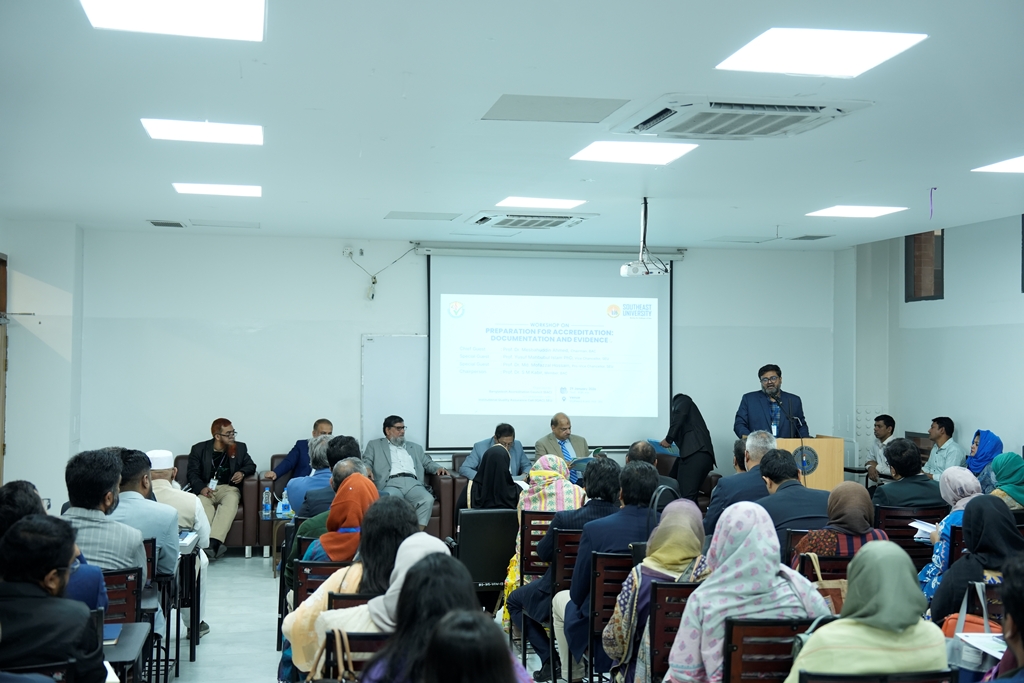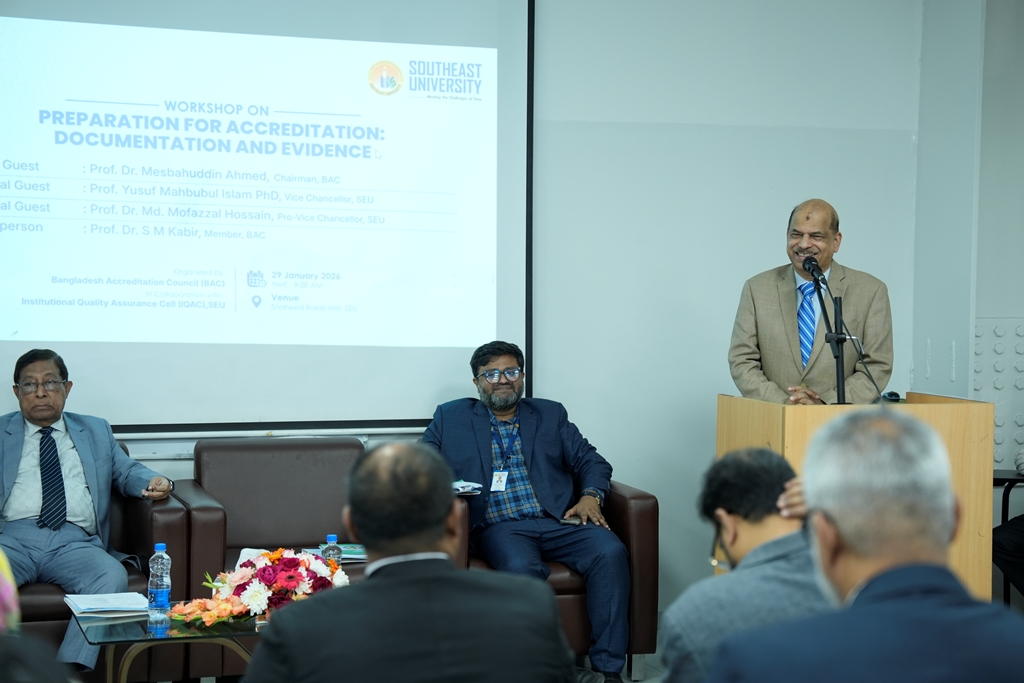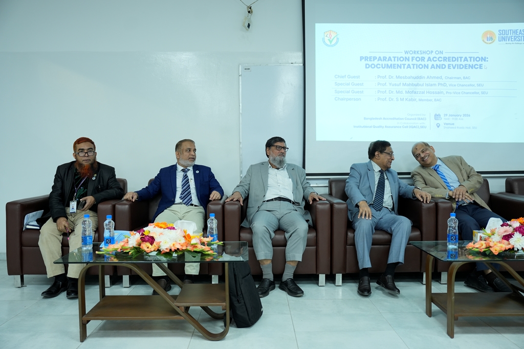 অ্যাকাডেমিক প্রোগ্রামের অ্যাক্রেডিটেশনের অভিপ্রায় ব্যক্ত করায় ২৯ জানুয়ারি ২০২৬ তারিখে বাংলাদেশ অ্যাক্রেডিটেশন কাউন্সিল ও সাউথইস্ট বিশ্ববিদ্যালয়-এর যৌথ আয়োজনে সাউথইস্ট বিশ্ববিদ্যালয়, ঢাকায় “Preparation for Accreditation: Documentation and Evidence” বিষয়ক কর্মশালা অনুষ্ঠিত হয়। কর্মশালায় স্বাগত বক্তব্য রাখেন ইউনিভার্সিটির IQAC এর পরিচালক অধ্যাপক ড. আব্দুল কাদের মুহাম্মদ মাসুম। উক্ত প্রোগ্রামে প্রধান অতিথি হিসেবে উপস্থিত ছিলেন কাউন্সিলের মাননীয় চেয়ারম্যান প্রফেসর ড. মেসবাহউদ্দিন আহমেদ, বিশেষ অতিথি হিসেবে উপস্থিত ছিলেন উক্ত বিশ্ববিদ্যালয়ের উপাচার্য প্রফেসর ড. ইউসুফ মাহবুবুল ইসলাম এবং উপ উপাচার্য প্রফেসর ড. এম মোফাজ্জল হোসেন। কর্মশালায় সভাপতি হিসেবে উপস্থিত ছিলেন কাউন্সিলের পূর্ণকালীন সদস্য প্রফেসর ড. এস. এম. কবীর। কাউন্সিলের পক্ষ থেকে কর্মশালায় উপস্থিত ছিলেন বাংলাদেশ অ্যাক্রেডিটেশন কাউন্সিলের অ্যাক্রেডিটেশন বিভাগের পরিচালক প্রফেসর নাসির উদ্দীন আহাম্মে্দ, উপপরিচালক ড. ফারজানা শারমিন। কর্মশালার প্রথম পর্ব পরিচালক প্রফেসর নাসির উদ্দীন আহাম্মেদের ধন্যবাদ প্রস্তাবের মাধ্যমে শেষ হয়। এছাড়া উপস্থিত ছিলেন বিশ্ববিদ্যালয়ের ট্রেজারার মহোদয়, বিভিন্ন অনুষদের ডিন, বিভাগীয় প্রধান এবং অন্যান্য সংশ্লিষ্ট ব্যক্তিবর্গ। কর্মশালায় মূল প্রবন্ধ উপস্থাপন করেন প্রফেসর ড. এস. এম. কবীর। তিনি অ্যাক্রেডিটেশন পদ্ধতি এবং এতদসংশ্লিষ্ট বিষয়ে বিভিন্ন ডকুমেন্ট এবং প্রমাণক সম্পর্কে বিস্তারিত আলোচনা করেন। কর্মশালার প্রশ্নোত্তর পর্বে ইউনিভার্সিটির উপাচার্য, ডিন, আইকিউএসির পরিচালক এবং শিক্ষকমন্ডলী অ্যাক্রেডিটেশন আবেদনের প্রস্তুতি সংশ্লিষ্ট বিভিন্ন বিষয়ে প্রশ্ন করেন এবং কাউন্সিলের মাননীয় চেয়ারম্যান এবং অ্যাক্রেডিটেশন বিভাগের পরিচালক তাদের সকল প্রশ্নের প্রেক্ষিতে বিভিন্ন বিষয়ে পরামর্শ প্রদান করেন।